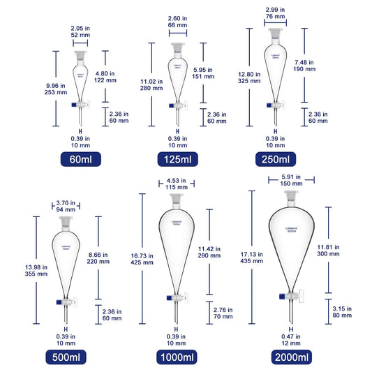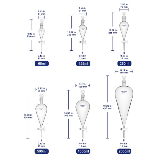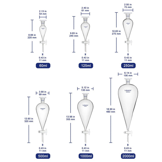 Conical Separatory Funnel with Glass Stopcock and 24/40 Plastic Joint Stopper, 60 – 2000 mL