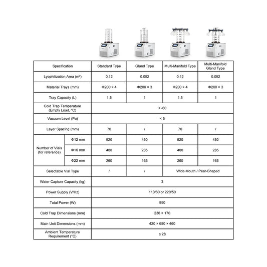 Benchtop Freeze Dryer, <60°C Cold Trap, 3 kg Water Capacity, 0.092-0.12 m2 Freeze Drying Area
