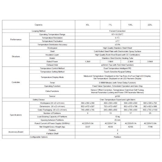 Forced Air Convection Drying Oven, RT+10-250°C, 43-225 L