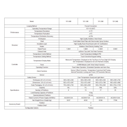 Natural Air Convection Drying Oven, RT+10-250°C, 43-225 L