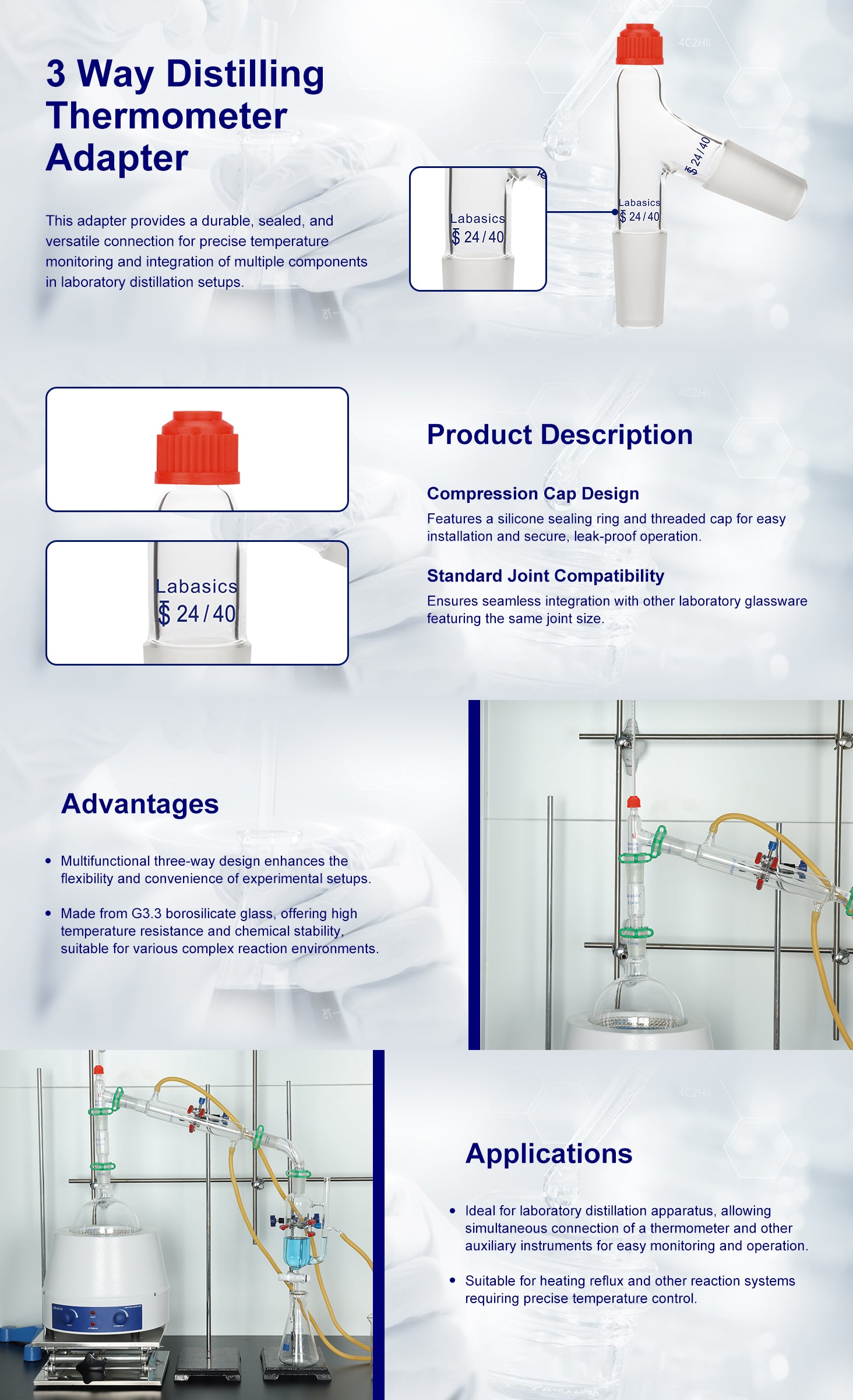 3 Way Distilling Thermometer Adapter 24/40 Joints Screw Cap