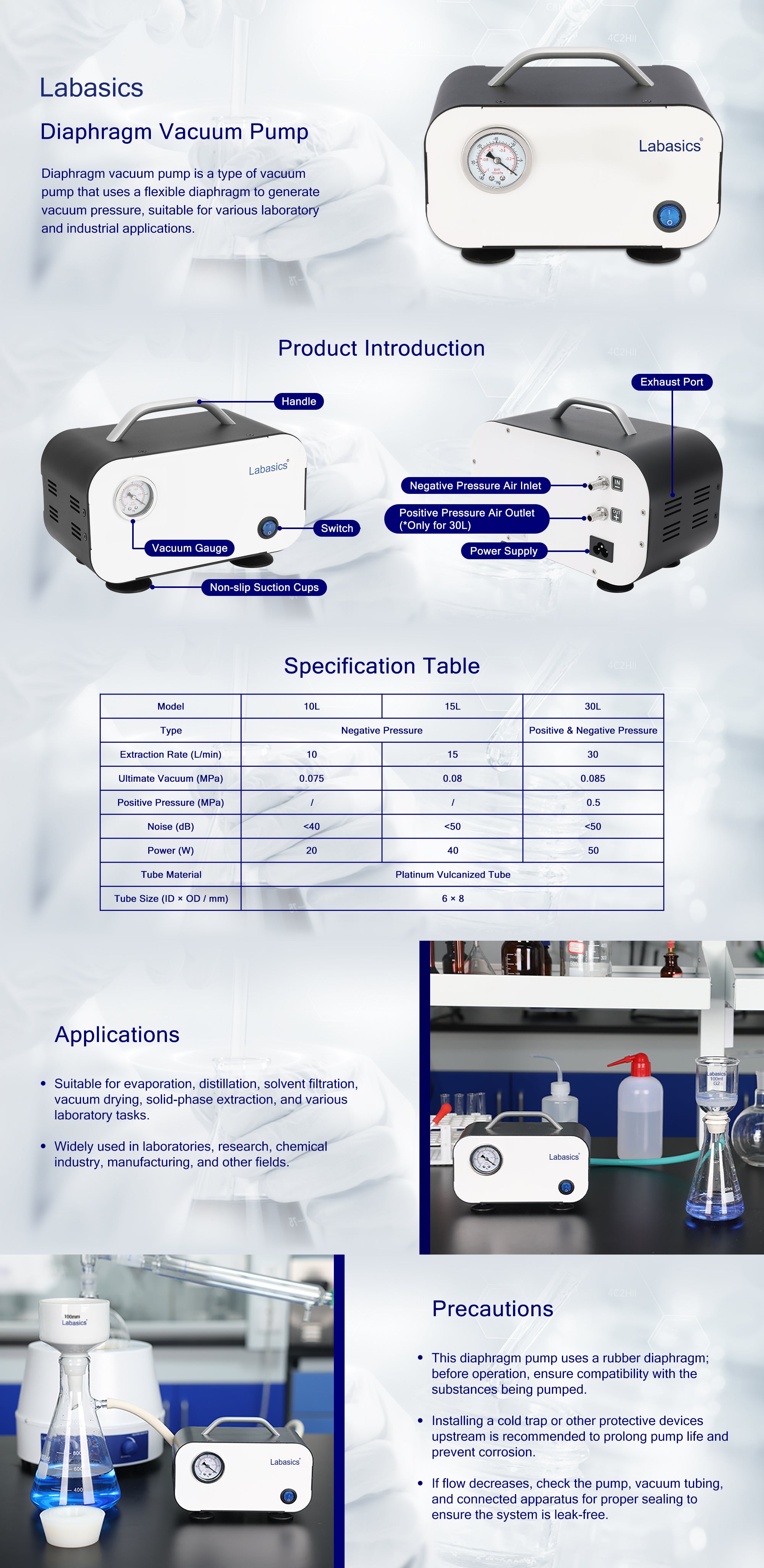 - Usage: Labasics oil-free diaphragm vacuum pump provides a clean, reliable, and environmentally friendly vacuum; suitable for evaporation, distillation, solvent filtration, vacuum desiccation, solid phase extraction, and more