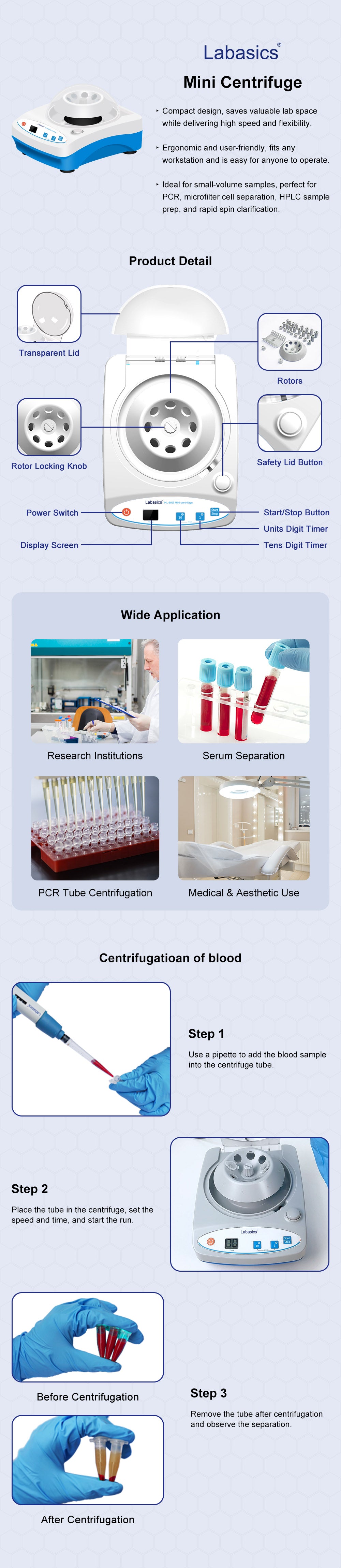 - Compact and Portable: mini handheld centrifuge occupies minimal space, ideal for small-volume sample processing such as DNA/protein lysis and PCR reaction preparation